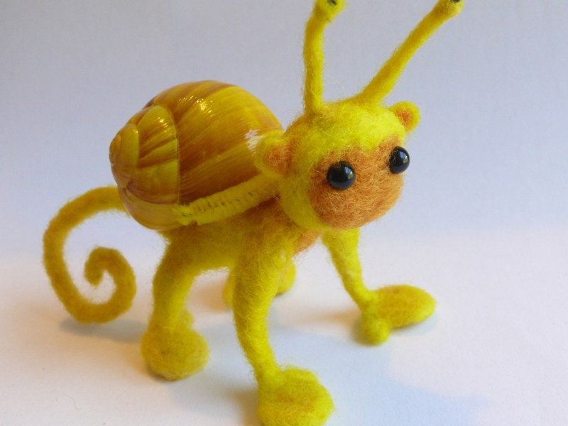 Made from needle felted wool over pipe cleaner armature, the snonkey is very soft and flexible with a real escargot snail shell on its back. Although there are many different varieties of snonkeys, you can sometimes tell a banana snonkey’s age by its color, as they start green and turn yellow and spotted just like bananas!